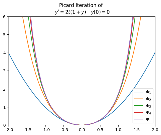 Proof by induction. For $ n = 1 $, $ \Phi_1(t) = \int_0^t 2s\left(1 + \Phi_0(s) \right) ds = t^2 $, where $ \Phi_0(t) = 0 $. We then need to show that if it is true for $ n = k $, then it also holds true for $ n = k + 1 $. $$ \begin{align*} \Phi_{k+1}(t) &= \int_0^t 2s \left( 1 + \Phi_k(s) \right) ds \\ &= \int_0^t 2s \left( 1 + s^2 + \frac{s^4}{2!} + \cdots + \frac{s^{2k}}{k!} \right) ds\\ &= \int_0^t 2s + 2s^3 + \frac{2s^5}{2!} + \cdots + \frac{2s^{2k+1}}{k!} ds \\ &= t^2 + \frac{t^4}{2!} + \frac{t^6}{3!} + \cdots + \frac{t^{2k+2}}{(k+1)!} \end{align*} $$ The infinite series $ \sum_{k=1}^{\infty} \frac{t^{2k}}{k!} $ converges to $ \Phi(t) = e^{t^2} - 1 $.